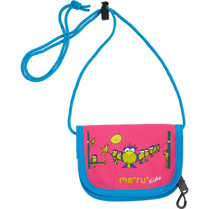 Vrolijk gekleurde kinderportemonnee om rond de hals te hangen met sleutelclip en adresvak